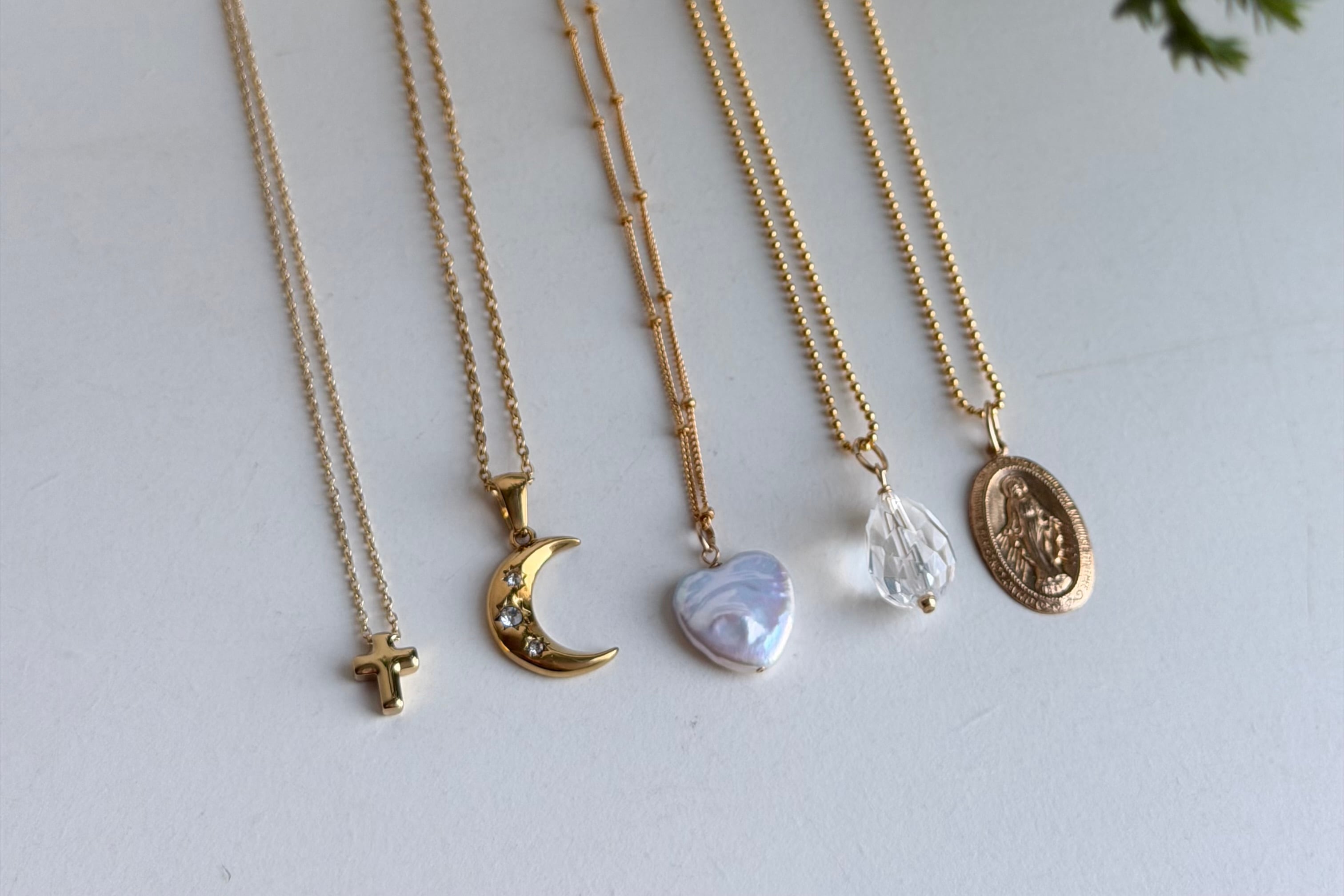 Luna necklace ルナネックレス 素材 : ステンレス(18kgp) サイズ : 長さ40cm +アジャスター5cm ルナチャーム12mm 小さなストーンを埋め込んだ月モチーフのネックレス。 さりげなくきらめくデザインで、首元に上品なアクセントを添えます。 ステンレスにK18のコーティングがしてあるため、多少の水濡れや皮脂にも強く変色しにくいです。 ※絶対に変色しないというわけではないのでご注意ください アレルギーのある方でも比較的反応が起きにくいアイテムですが個人差があるため、当店では“アレルギー対応”の表記はありません。