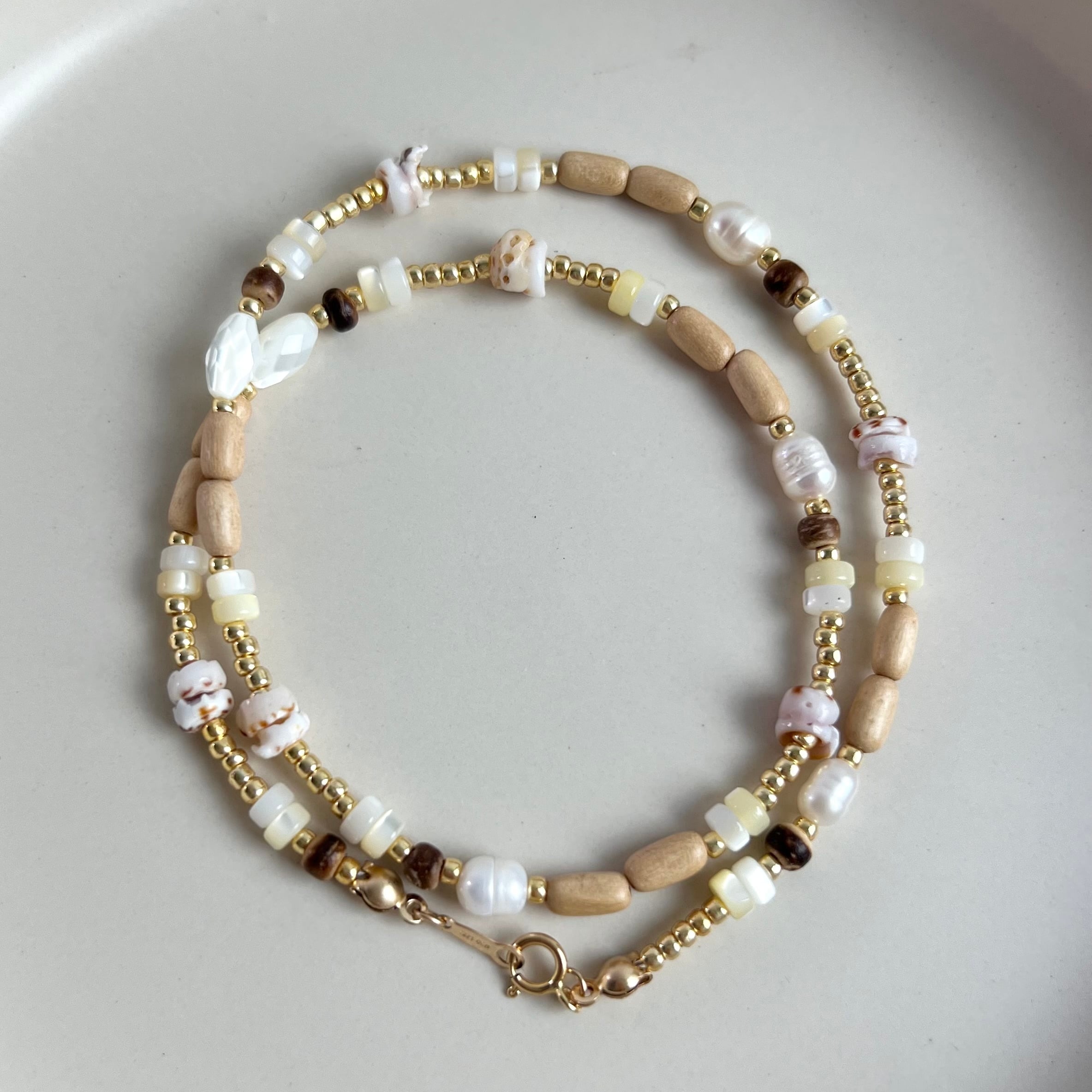 ウッドビーズをベースに淡水パールやシェルでまとめ落ち着いた雰囲気の【Wood】